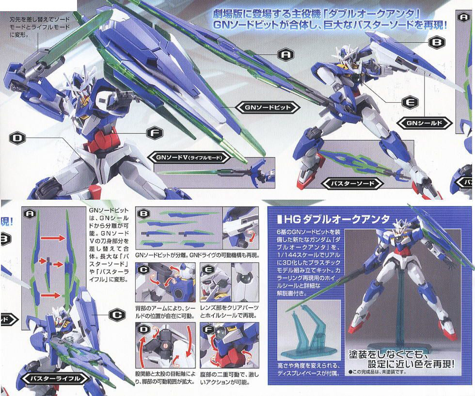 Used in the Gundam 00 movie, features translucent plastic to replicate GN Condensers and GN Sword bits that can combine. A display stand is included