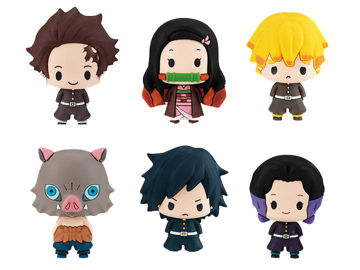 From the popular anime and manga series Demon Slayer: Kimetso no Yaiba comes an adorable box of 6 Chokorin Mascot mini figures! This set includes Tanjirou, Inosuke, Zenitsu, Nezuko, Giyuu, and Shinobu as adorable chibi-fied vinyl 2-inch figures. Each come with a pedestal to display them anywhere!
