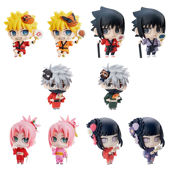 This Petit Chara Land box of 10 different 1-inch figures features Naruto, Hinata, Sakura, Sasuke, and Kakashi in different colorways.