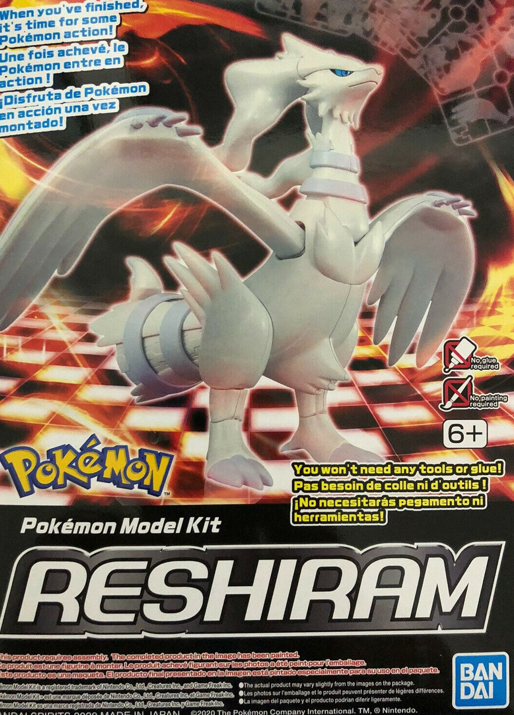 This cute Reshiram Pokeman kit comes with 'PokePura' action which means it is designed so the wings flap when you move the head back and forth. All parts are molded in color and snap fit together so no paint or glue are required. Stickers for the eyes are also included