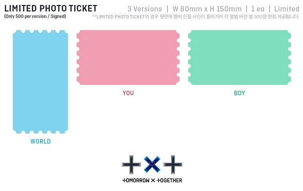 - Limited Photo Ticket: 1x each version / Only for 500 copies (randomly inserted in copies from the first pressing) ** Member signed in the back of Limited Photo Ticket, each version 500 pcs limited.