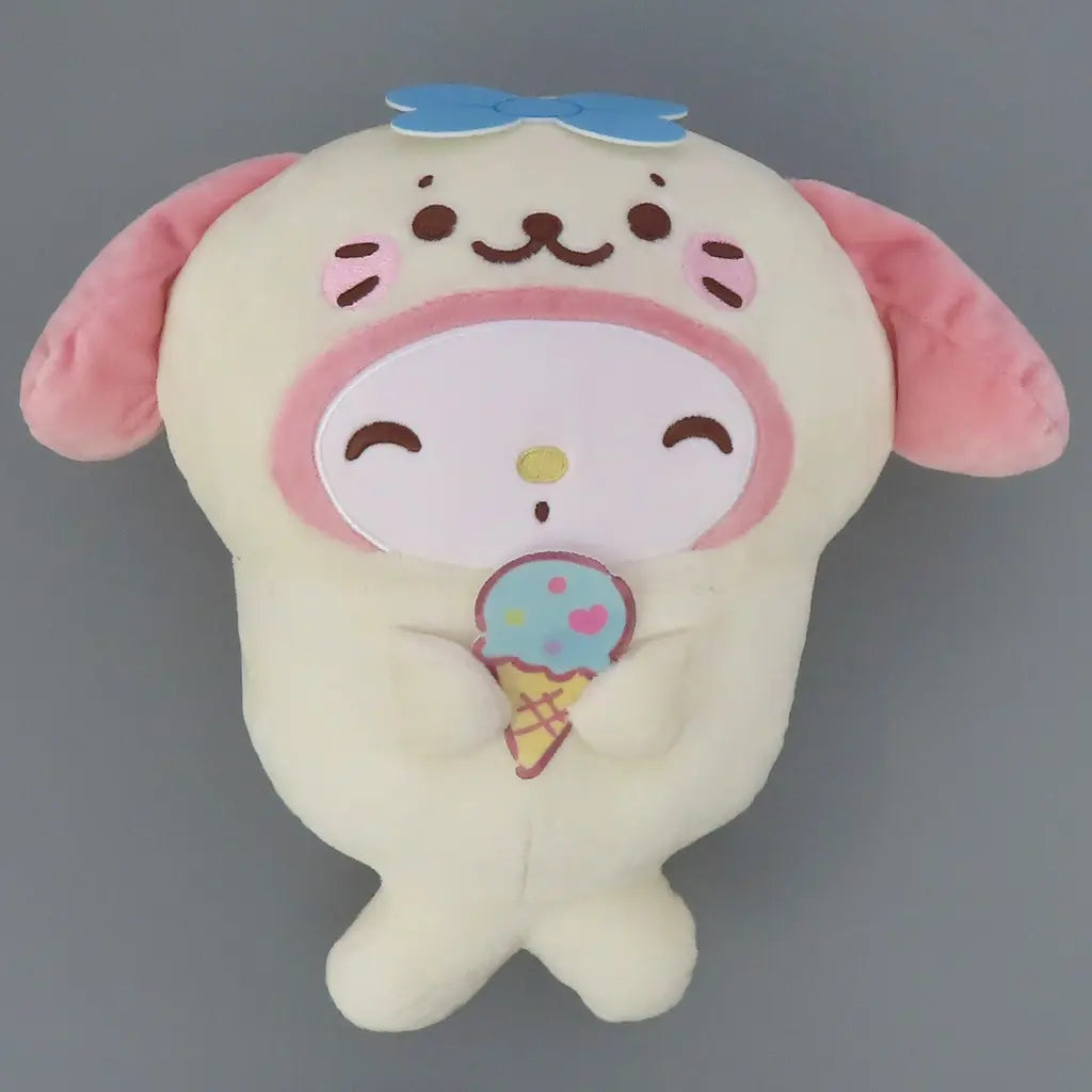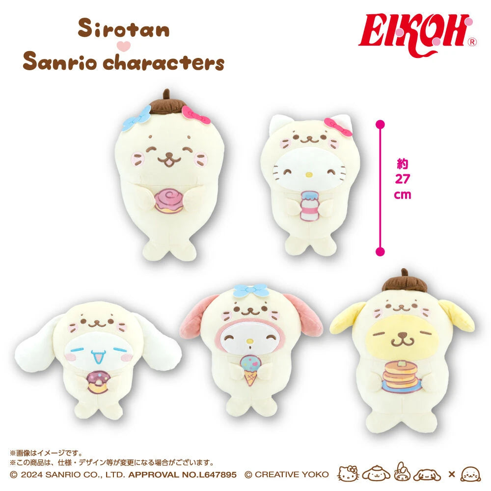 Sanrio characters and SIROTAN in a cute collaboration! Each holding delicious sweets and posing with big smiles!