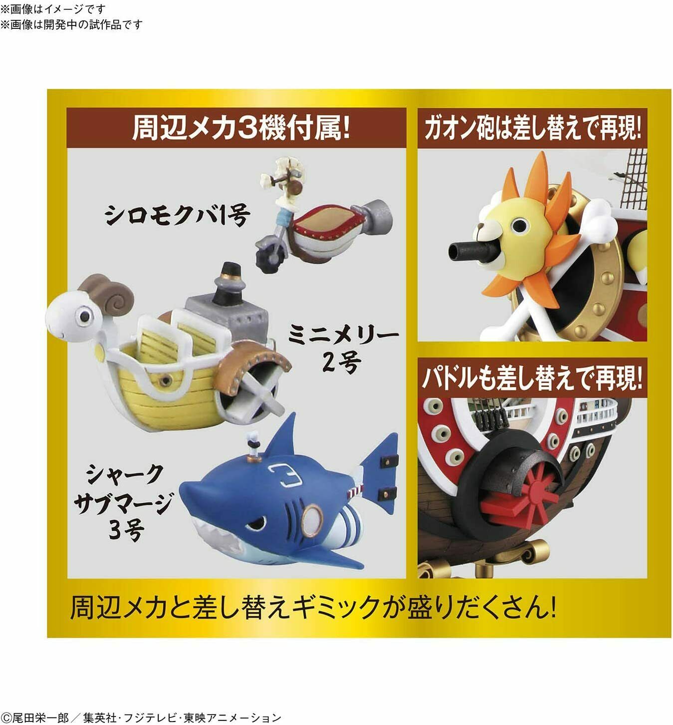 The Land of Wano arc version of the Thousand Sunny from ONE PIECE will be available as a plastic model kit! Newly designed marking stickers and water decals to recreate the damage the ship suffered when it snuck in are included. Newly designed figures of all nine of the Straw hat Pirates in their Land of Wano arc attire are also included! Accessories include White hobby horse No1, Mini Merry No2, Shark Sumberge No. 3, and display base. Interchangeable parts are available to recreate Gaon Cannon and paddles on the side of the ship.