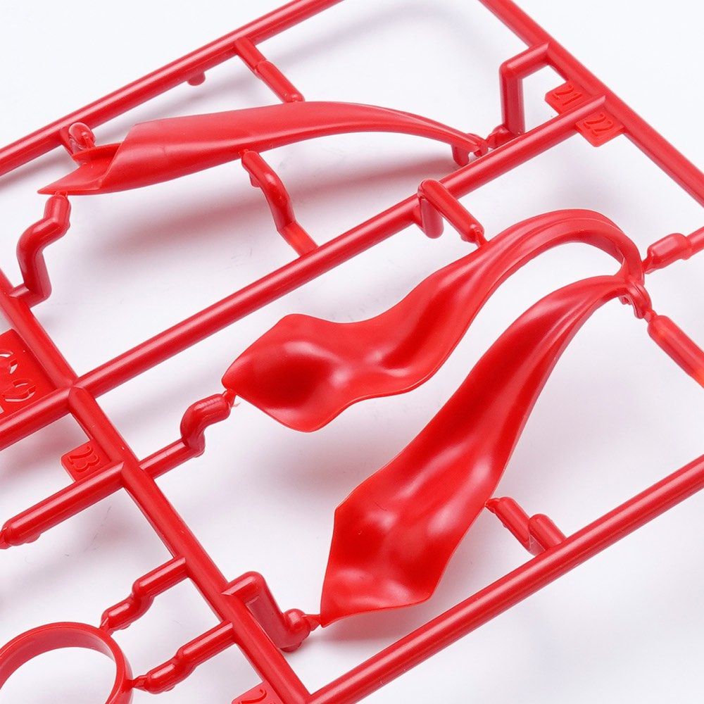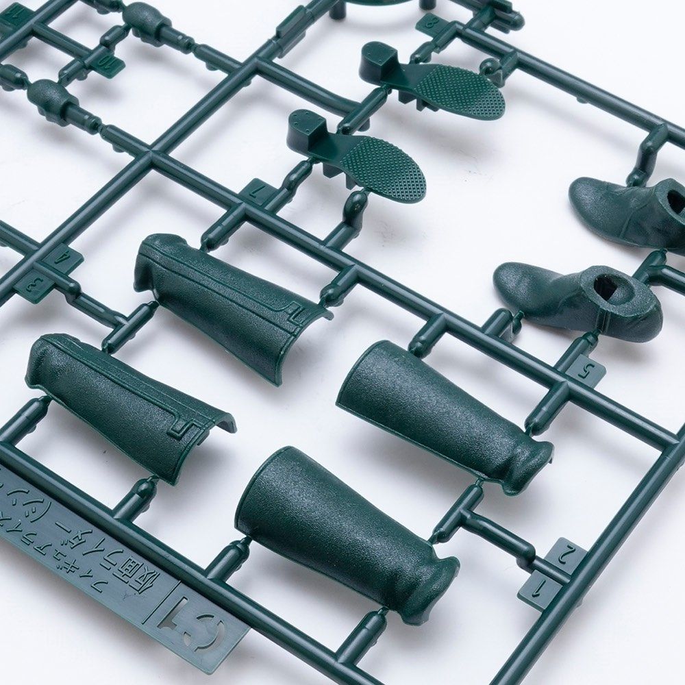 Two types of hand parts are included: a gripped hand and an open hand. In addition, the muffler comes with two types, one that is hanging down and another that can be adjusted to the angle.