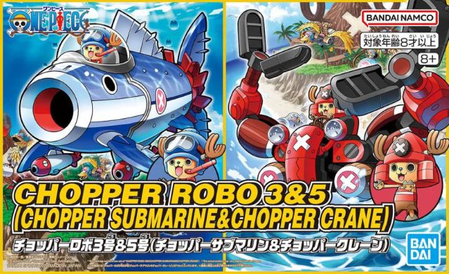 The original mecha Chopper Robo from "One Piece" is now available as a set, with Chopper Robo No. 3 Chopper Submarine and Chopper Robo No. 5 Chopper Crane! The set includes two figures of Chopper himself, one sitting and one standing, and two types of faces. A variety of expressions can be created with the included stickers! You can combine these Chopper Robos to assemble Chopper Salvage 3x5, and they can also be combined with Chopper Robo no.1 Tank and Chopper Robo No.2 Chopper wing, and Chopper Robo No. 4 Chopper Drill (sold separately) to create Giant Chopper Robo! Order it for your own collection today!