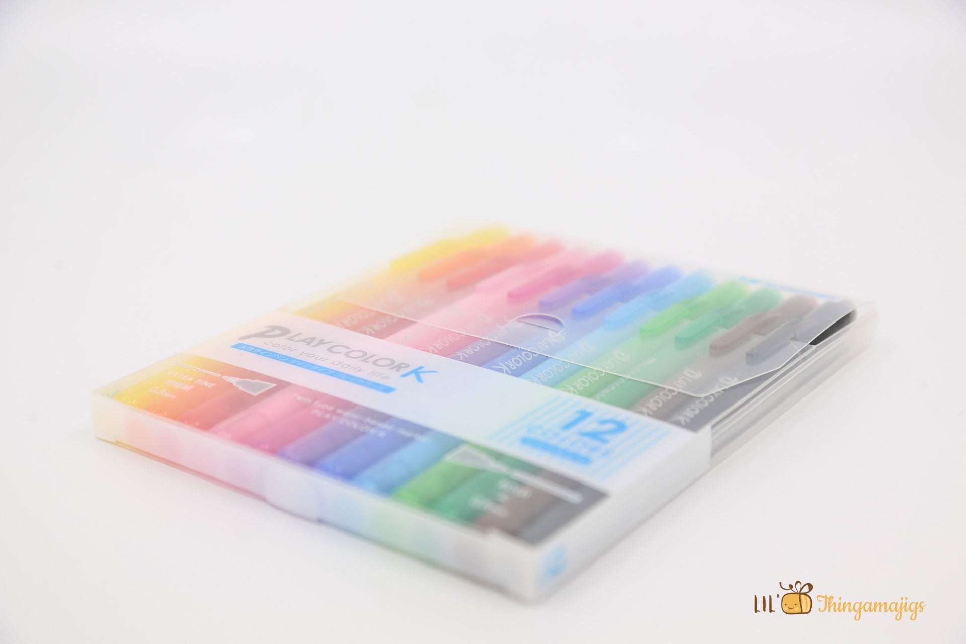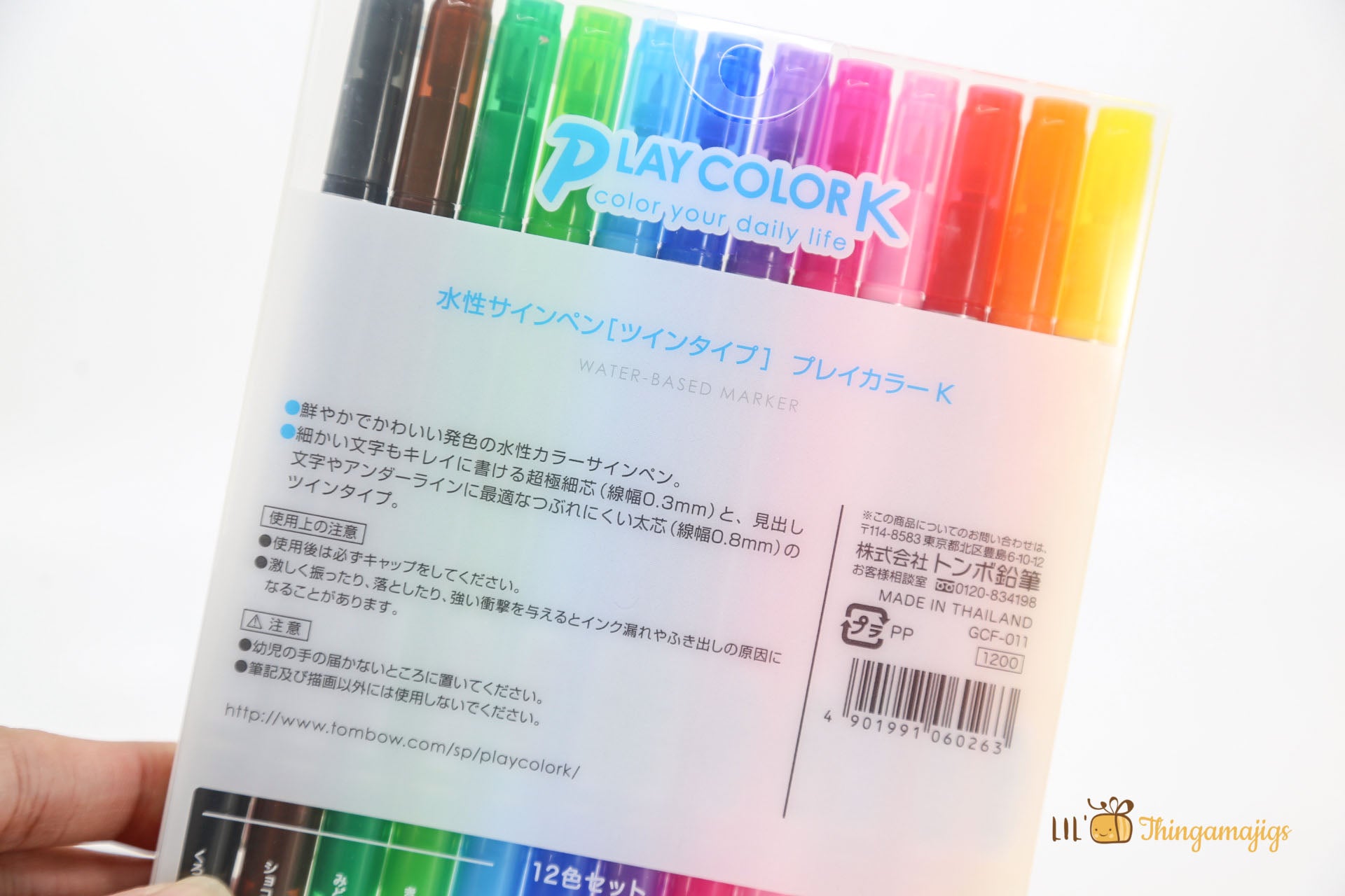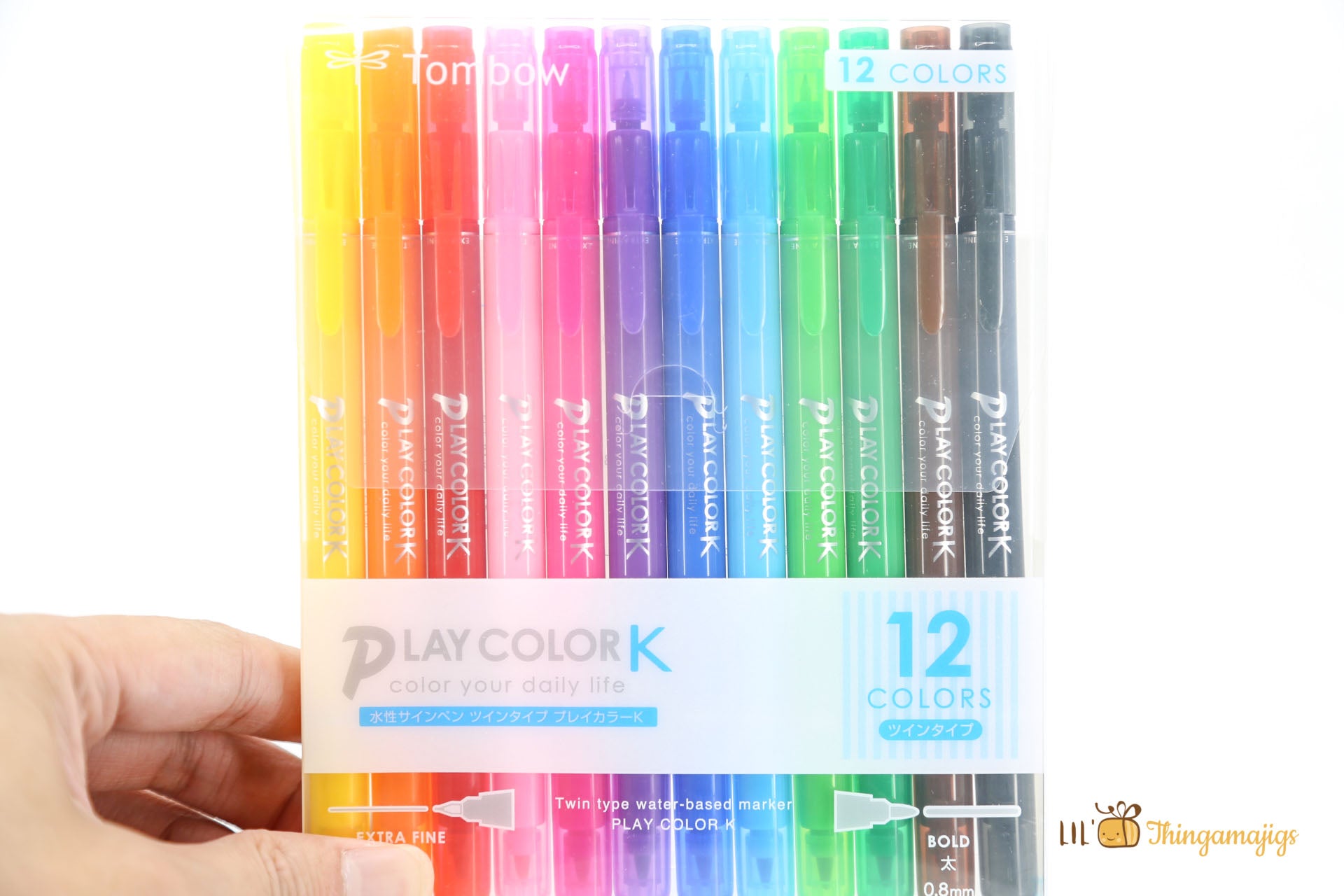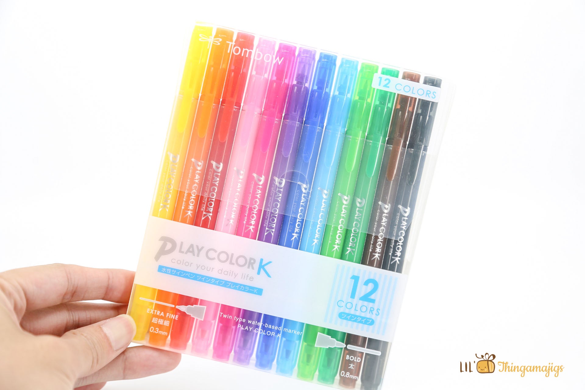 Tombow Play Color K Double-sided Marker 12 color set - 0.3mm and 0.8mm's convenient double-sided design make these markers a game changer for artists! Each marker has two tips, offering great versatility for drawing thick and thin lines, and coloring. The extra fine tip draws lines that are 0.3 mm, while the broad bullet tip draws 0.8 mm lines. The ink is water-based and dye-based. Endless possibilities are at your fingertips as you get creative in your work!